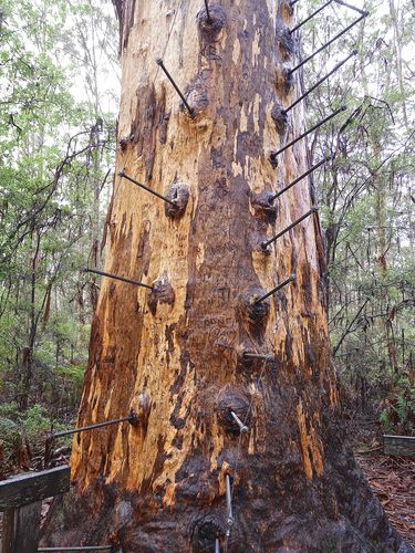 Gloucester Tree, à escalader à l'aide de l'échelle rudimentaire fixée au tronc, par beau temps, sans sac à dos et avec des chaussures adaptées. Maximum de neuf personnes à la fois sur l'arbre. Du sommet, la vue est imprenable.