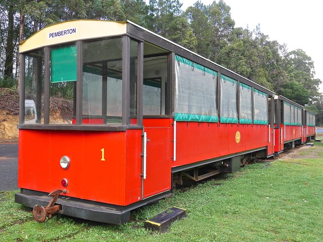 Une autre attraction de Pemberton : le tramway (ci-dessous) qui vous mène de la gare de la ville au pont de la rivière Warren, à travers les forêts de karris et de jarrahs, pendant près de deux heures, en franchissant six ponts et des cours d'eau. Le petit train fait aussi une halte devant des cascades. Le conducteur du tram, lui, commente au fur et à mesure cette visite qu'il vaut mieux effectuer par temps ensoleillé.