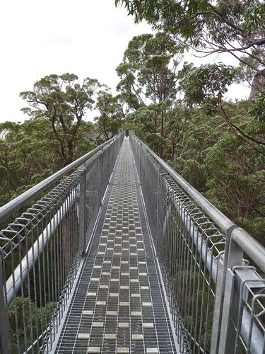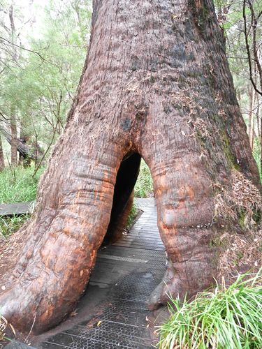 Après avoir rempli mon réservoir (il me reste un demi-plein mais on n'est jamais trop prudent car en Australie, les stations-service ne sont pas légion !), je me dirige vers Denmark, située à près de 200 kilomètres de là. Et de traverser à nouveau plusieurs parcs nationaux, jusqu'à arriver à la Vallée des Géants, qui offre de faire une expérience inédite : se promener entre les cimes des arbres, grâce à une passerelle aérienne (ci-dessous) longue de 600 mètres. L'expérience vaut la peine d'être tentée, à la fois pour la sensation unique de dominer les eucalyptus géants Tingle et pour la vue panoramique tout autour. C'est en 1995 que la passerelle fut mise en service afin de protéger la célèbre forêt du piétinement des milliers de visiteurs. L'ensemble consiste en une sorte de pont suspendu à quarante mètres au-dessus du sol, qui repose sur sept pylônes, sorte de passerelle formée de plusieurs tronçons de 60 mètres. Il est ainsi possible d'admirer la forêt sans la détruire : la plupart des espèces végétales de cet endroit ne vivent que dans le sud-ouest de l’Australie occidentale et certaines d'entre elles sont là depuis 65 millions d'années, du temps du continent Gondwana (alors que l'Australie était encore rattachée aux continents africain et indien). Là vivent plusieurs espèces de marsupiaux ainsi que d'autres petits animaux. Une exposition gratuite (à droite des bureaux de vente des billets) explique en détails la faune et la flore du lieu. L'arbre prédominant de cette vallée des géants est le Red Tingle, l'eucalyptus Jacksonii. A noter que le nom tingle tient ses origines du peuple aborigène et signifie « plein de ». Il n'a pas vraiment de traduction. En me promenant entre ces arbres, je découvrirai qu'un grand nombre d'entre eux ont le tronc creux (comme ci-dessous, sur la deuxième photo) au point de former une sorte de tunnel. Cet arbre est identifiable à son tronc fibreux de couleur rouge gris et son tronc peut atteindre 20 mètres de circonférence, ce qui en fait le plus gros eucalyptus au monde. On trouve cet arbre uniquement sur une zone de 6000 hectares, délimitée par la Deep River à l'ouest, la Bow River à l'est et sur les dix kilomètres de côtes. Les cavités des eucalyptus tingle sont provoquées par le feu, les champignons ou par des insectes, et ce, sur une très longue période. L'arbre, contrairement à d'autres eucalyptus, ne possède pas de racine pivotante, mais un système de racines plus en surface qui s'étale au fil des ans, formant des contreforts. Cet eucalyptus doit attendre sa trentième année avant de donner ses premières fleurs, une fois tous les quatre ans et généralement à la fin de l'été et au début de l'automne.