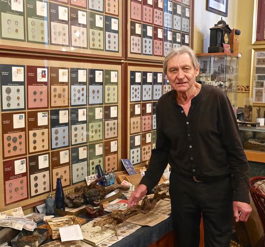 Lorsque j'atteins Southern Cross, il est temps pour moi de marquer un arrêt autour d'un bon café. A un croisement, je repère tout de suite le Palace Hotel (ci-dessous) et me gare à quelques mètres de là, en face d'un café. Je parle de mon site internet à la serveuse, lui remets ma carte, puis m'installe en salle en attendant qu'on m'apporte ma commande (il est courant en Australie de se faire servir partout à table). Un instant plus tard, un monsieur s'avance vers moi et me remet sa carte en m'invitant à le suivre à son hôtel. C'est Stan Davidenko, le propriétaire de l'établissement qui veut me montrer quelque chose d'exceptionnel. Je prends mon petit-déjeuner puis me rends à l'hôtel. Je suis accueilli par une jeune fille belge, tout juste débarquée ici il y a quelques semaines dans le cadre d'un contrat de travail pour étudiant. L'hôtel fut bâti en 1911 et est l'un des trois derniers hôtels du district de Yilgarn datant de la ruée vers l'or. A l'époque, Southern Cross était le point de départ pour partir prospecter dans la région. Un résident local le racheta en 1990 puis le restaura. Ce que les clients de passage ignorent, c'est que Stan est aussi un collectionneur invétéré de pièces de monnaie (ci-dessous, sur la deuxième photo), et ce, depuis 35 années. Il tiendra aussi à me montrer un petit cochon à deux têtes, né dans les années 1970 à deux pas d'ici. Et m'offrira même une bouteille de vin maison, produite par son frère du côté de Margaret's River. Décidément Southern Cross est plein de surprises.