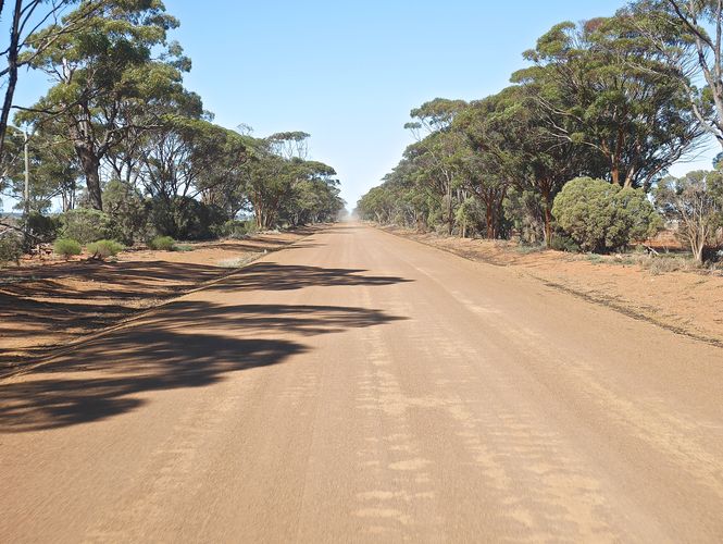 Il me restait encore une longue route à parcourir pour me rendre jusqu'à Hyden, d'après mon GPS. Ayant parlé de mon projet au café, un habitant me conseilla de prendre un chemin de traverse qui me ferait gagner quarante minutes. Par contre, il ne s'agit pas d'une véritable route mais d'une piste (gravel road est le terme anglais) bien entretenu qui permet de rouler à bonne allure. Je tente le coup et traverserai ainsi un paysage souvent transformé par la main de l'homme arrivée là au début du vingtième siècle. Certaines pièces de terre furent alors débarrassées de leur végétation originelle pour permettre la culture céréalière ou l'élevage de bétail. Je me trouve ici au cœur d'une importante région agricole. Et les pistes sont autant de routes permettant aux agriculteurs d'accéder à leurs terres. Je croiserai peut être six véhicules en deux heures de temps, au milieu de cette pampa. Un épais nuage de poussière se soulève derrière mon camping-car et je sens qu'il faudrait mieux ne pas avoir besoin de freiner urgemment sur ce type de revêtement car le dérapage serait garanti.