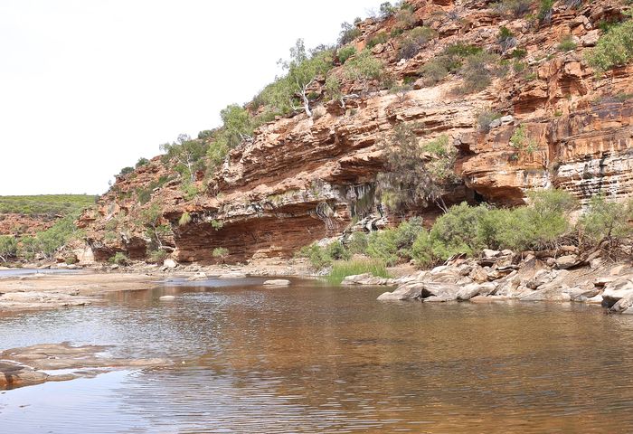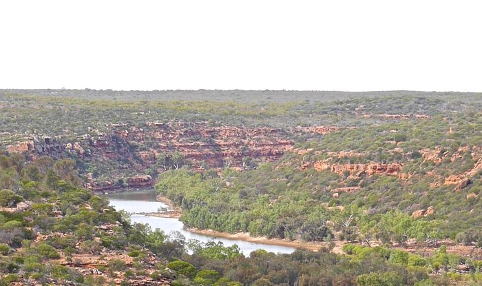 Le parc national de Kalbarri a une superficie de 1830 km2 et se trouve au-dessus de Geraldton. Je m'arrêterai successivement aux gorges de la rivière Murchison, puis le long de la côte de l'océan Indien, qui offre des points de vue spectaculaires. Le temps est au beau fixe et c'est une bonne nouvelle. Le paysage de ce parc a été façonné au fil du temps, un paysage que le peuple aborigène Nanda a eu le temps d'observer, lui qui occupe ces terres depuis fort longtemps. Ma première halte me conduit à Ross Graham, du nom du premier maitre d'école du cours élémentaire de la petite ville de Kalbarri. Cet homme, amoureux de la nature et passionné par l'environnement, a largement contribué par son action à faire classer le présent territoire en parc national. Il mourra jeune, à 31 ans, en 1967. Ross Graham offre deux points de vue attrayants, un premier, sur la rivière Murchison dans son ensemble et avec ses gorges. Puis un second point d'observation, pour lequel le visiteur est invité à suivre un petit sentier sur 300 mètres qui descend vers la rivière elle-même et ses quelques mares (la rivière est actuellement à sec par manque de pluie). J'admirerai les gorges de couleur ocre qui tranchent avec le reste du paysage.