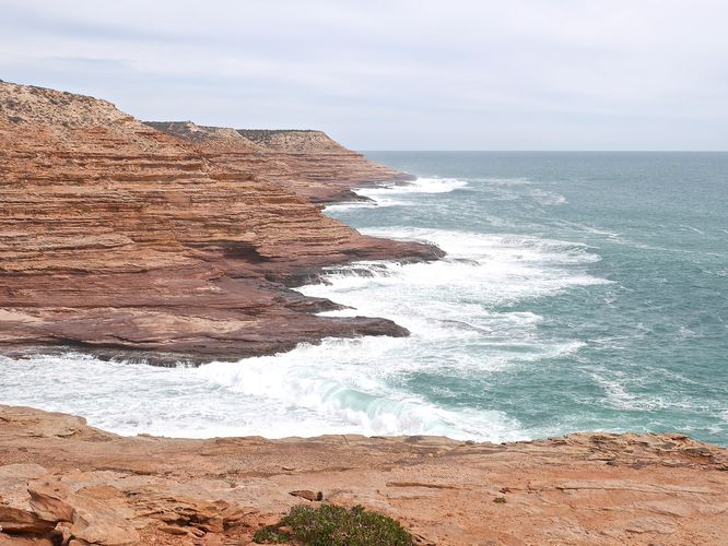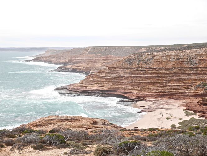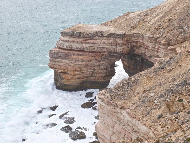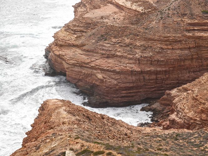 La route vers la petite ville de Kalbarri est assez étroite mais bonne, bien que gravillonneuse (attention aux pare-brise) dans sa dernière partie. Des travaux ont d'ailleurs lieu actuellement à l'entrée de Kalbarri. De 1500 âmes hors saison, la petite station balnéaire passe à 10 000 occupants en période estivale. La ville ne recèle aucune curiosité particulière mais attire sans doute par sa petite baie ensoleillée. On peut en autre nourrir des pélicans ou aller voir le mémorial dédié au navire hollandais Zuytdorp qui se fracassa non loin de là, entre Kalbarri et la baie des Requins, en 1712. L'intérêt principal de l'endroit reste, encore et toujours, le parc national. Il y a bien une route qui conduit à une trentaine de kilomètres de là à un point de vue appelé West Loop Look out et Natures Windows, mais la route est inaccessible aujourd'hui (pour cause d'entretien). Je vais donc suivre la route du célèbre George Grey qui débarqua dans le coin en 1839, lui aussi à la suite du naufrage de son navire. Il fera partie des survivants et en profitera pour partir à la découverte du peuple aborigène Nanda, visitant notamment un de leurs villages constitués de huttes. La route que je vais emprunter est un ravissement et offre des paysages à couper le souffle. Je laisserai d'abord sur ma droite Red Bluff où se trouve l'une des plages préférées des Australiens pour pratiquer le surf. A noter que Red Bluff était un repère important pour les navigateurs hollandais qui naviguaient dans la zone, il y a trois siècles. Puis, m'arrêterai à Pot Alley (ci-dessous) avec sa plage en contrebas où s'engouffrent d'énormes vagues d'écume.