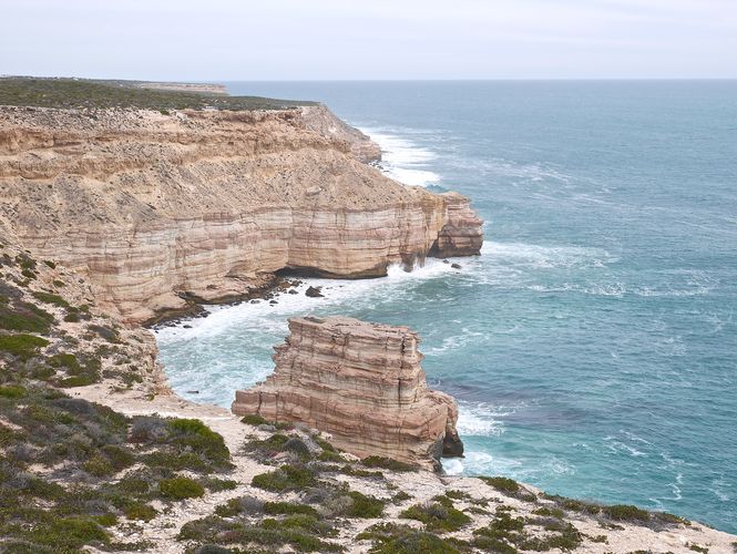 Quelques kilomètres plus bas, j'arrive à Eagle Gorge (la gorge de l'aigle, ci-dessous en photo) qui offre un superbe panorama sur la crête et vous emmène dans les tréfonds d'une gorge où se trouvee une plage. Si vous avez de la chance, vous observerez peut être des aigles en train d'errer dans le ciel, à la recherche de proies. Les falaises qui bordent cette côte de Kalbarri sont constituées de grès depuis 480 millions d'années. Et sont souvent coiffées d'une couche de dépôt calcaire qui, lui, a deux millions d'années (seulement). Ma prochaine halte s'effectuera à Shellhouse Grandstand (comme grandiose!) avec un point de vue extraordinaire (deuxième photo ci-dessous), avant de me rendre aux deux derniers points d'observation de mon circuit : Island Rock (troisième photo) et Natural Bridge (quatrième photo). C'est la force de l'océan et des éléments qui ont façonné ces formations rocheuses fragiles dans ces falaises pourtant imposantes. Sur ma dernière étape, Castle Cove abrite plus de vingt espèces de plantes que le randonneur découvrira sur place en lisant les panneaux répartis sur le parcours de randonnée qui est proposé aux bons marcheurs. Il semblerait cependant que les lapins posent problème à cet endroit, en creusant des galeries dans le sol sablonneux, déstabilisant ainsi et par endroits le terrain. Raison de plus pour ne pas sortir des sentiers balisés. Et ils sont nombreux ces sentiers, dont le conservateur Eric Pederick, conservateur enthousiaste, contribua largement à la construction. Notre homme sillonnera en effet de longues années durant toute cette zone, découvrant des gorges (et leur attribuant des noms) et des chemins de traverse qui deviendront pour certains les chemins de randonnée aujourd'hui ouverts aux milliers de visiteurs chaque année.