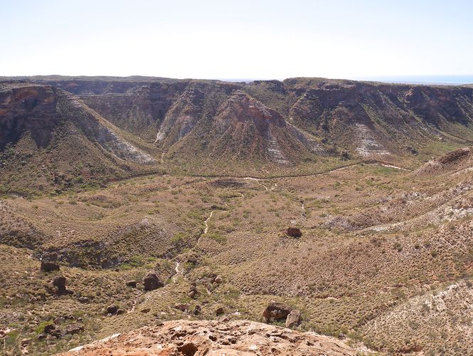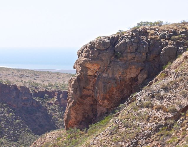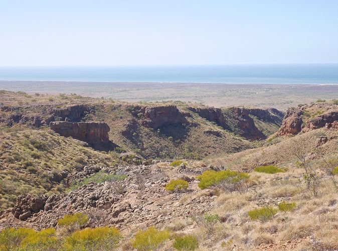 Plus loin sur ma route pour Exmouth, un panneau m'indique que le parc national de Cape Range se trouve à onze kilomètres. La petite route, d'abord goudronnée, se transformera ensuite en une piste assez chaotique sur laquelle je roulerai au pas pour ménager mon véhicule. Là, pas de plages mais des panoramas impressionnants de gorges et de canyons. Le parc, qui s'étend sur 50581 hectares (80 km de long sur 20 km de large) abrite en réalité émeus et kangourous rouges en quantités, et un nombre incalculable de fleurs sauvages. Le parc a un point culminant situé à 324 mètres et comptabilise plus de 400 caves, et des gorges spectaculaires. Les passionnés de randonnées y trouveront leur compte grâce aux nombreux parcours qui les attendent comme, par exemple, la balade scénique sur la Charles Knife Canyon Road, ou bien la balade des gorges sur la piste de la Shothole Canyon Road (première photo ci-dessous). Il semblerait que ce parc ait échappé au pire durant les années 1950, lorsque les Pétroles Australiens (devenus depuis Chevron) se mirent à prospecter du côté de Rough Range (deuxième photo ci-dessous) avec un premier puits, en vain. Neuf autres puits seront pourtant creusés, dont le N°2, en 1955 mais, après avoir creusé sur 4992 mètres, on dut se résoudre à abandonner les recherches. Comme d'habitude, je n'emprunterai pas la bonne entrée du parc car je ne rencontrerai aucun centre d'accueil du parc sur mon chemin qui s'avérera au bout du compte être un cul-de-sac.