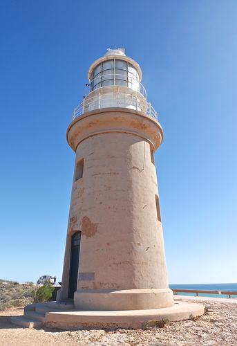 J'ai de la chance car il fait aujourd'hui un soleil radieux et la baie du Cap nord-ouest brille de tous ses feux (ci-dessous). Au large, de puissants courants marins forment des vagues en surface. Un petit phare (deuxième photo) se dresse sur les hauteurs mais son existence est relativement récente. Le 8 mars 1907, le navire SS Mildura (troisième photo) quittait le port de Wyndham avec 498 têtes de bétail destinées à être exportées vers Fremantle. Quatre jours plus tard survint un cyclone qui poussa le navire sur les récifs juste au Cap nord-ouest. Hommes et animaux s'en sortirent sans trop de dommages, bien qu'un bon nombre de bestiaux ne parviendra pas à rejoindre la terre ferme (pourtant proche) à la nage et périra. Le navire, lui non plus ne subira pas trop de dégâts et fera l'objet d'une opération de sauvetage. Mais cet accident poussera les habitants à faire pression pour que soit enfin installé un phare couvrant cette baie certes fréquentée sans encombres par d'autres navires mais restant tout de même potentiellement dangereuse. Le gouvernement ouest-australien se résoudra à emprunter l'argent nécessaire à la construction de ce phare de douze mètres de haut et de plus de cinq mètres de diamètre. L'ensemble sera bâti en pierre et en ciment. Quant à la lanterne, elle sera livrée depuis Birmingham (Royaume-Uni) et fonctionnera au kérosène. Son éclat était visible par nuit claire jusqu'à 35 kilomètres par les navires circulant au large. Ce phare, inauguré le 10 décembre 1912, restera en service jusqu'en avril 1967. A partir de cette date, c'est un phare lumineux, juché au sommet de la onzième tour de la station de radio, toute proche, qui prendra le relais. Plusieurs gardiens de phare se relaieront entre temps pour garder l'endroit, d'abord des hommes, puis des couples dont Madame et Monsieur Butler (en 1914) qui se souviennent encore que le courrier était livré à dos de chameau depuis Onslow (à 200 km de là). Quant au ravitaillement, il arrivait par bateau avec plus ou moins de régularité. Et de se nourrir parfois de lait de chèvre (qu'on trouvait en abondance par place, par rapport à l'eau qui restait encore rare!)