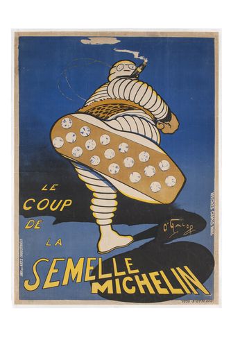 Quant à Marius Roussillon, aussi connu sous le nom de O'Galop, il forgera son trait grâce à la publication de nombreux dessins satiriques dans le Chat Noir, le Rire, le Pêle-Mêle et bien d'autres titres encore. Sa rencontre avec les Frères Michelin scellera son destin d'affichiste à celle du Bibendum (photo ci-dessous). Et d'inventer le célèbre personnage, tout en le déclinant à l'infini. L'objectif de O'Galop est clairement de taper dans l'oeil du public avec des affiches claires et percutantes mais simples à comprendre. Il mise ainsi sur l'efficacité du dessin et du message. Notre homme travaillera également pour plusieurs autres firmes, sans pour autant abandonner la satire.