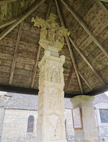 Je prends à présent la route de Bassignac le Haut, où vivent quelques Bassignacois(es). Outre l'église (ci-dessous) qui date de la fin du XV ème-début du XVI ème siècle, se dresse la croix couverte du calvaire (deuxième photo), appelée aussi croix monumentale. D'origine chrétienne, celle-ci peut être en bois, en métal ou en pierre et fait partie d'un calvaire. Ce n'est que vers le XI ème siècle, avec l'émergence de l'art roman, que cette croix deviendra monumentale, pour atteindre son apogée au XVI ème siècle. Et ces lieux de rassembler, lors de fêtes religieuses ou pour prier ou solliciter la grâce de Dieu contre les fléaux de tous genres. A Imons Vielzot, autre petit village du canton, se dresse la croix de Saint Etienne et son puits de légende.