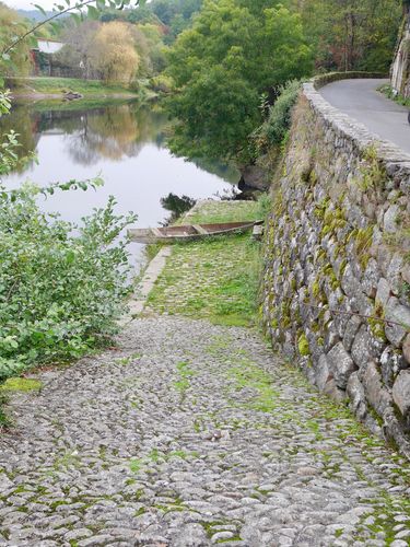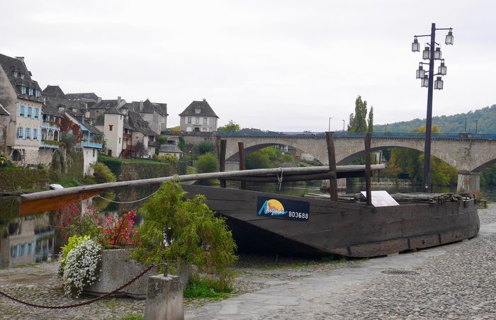 Je descends la rue jusqu’aux quais de la Dordogne où j'aperçois un courpet (gabare, ci-dessous). Jadis, ces bateaux naviguaient d'Argentat à Libourne. Il s'agissait d'une descente saisonnière, au printemps et à l'automne lors des périodes de crues, pendant une trentaine de jours par an. Le gabarier (pilote de courpet) devait alors tout faire afin d'éviter les malpas (tourbillons, courants, falaises et rochers immergés) qui pouvaient être mortels. Une fois à destination, les embarcations étaient désossées et vendues comme bois de chauffage. Les hommes, eux, remontaient à pied. Au plus fort du trafic, entre 1858 et 1867, le port d'Argentat transportait ainsi 3400 tonnes par an, ce qui nécessitait la construction de plus de 300 courpets éphémères. Ces gabares étaient construites en tremble, aulne ou bouleau et avaient toutes une architecture identique. Elles approvisionnaient en bois, merrain (douves de chêne destinées à la tonnellerie), et carassonne (piquets de vignes en châtaignier) les pays viticoles du Bordelais, ainsi que d'autres denrées (fromage, châtaignes, cuir et charbon). Cette activité disparaitra toutefois dans les années 1920, avec l'arrivée du chemin de fer en ville. Les mérandiers (deuxième photo ci-dessous) étaient des paysans-bateliers qui faisaient le voyage afin de vendre leur production (piquets ou merrains) puis remontaient en Corrèze à dos de mulets.