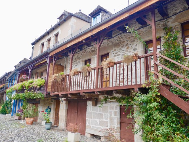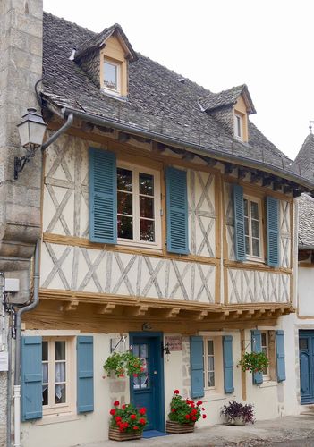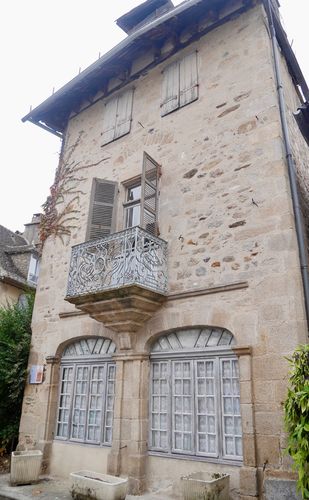 J'arrive ensuite au Manoir de l'Eyrial (photo ci-dessous), plus ancienne demeure de la ville, datée de 1457. Le sol était la propriété du doyen de Carennac, et la maison sera occupée par le consistoire protestant, avant de devenir une maison consulaire. Elle aurait subi l'attaque du bandit Mandrin venu ici en 1754 pour piller des entrepôts à tabac. Restée maison seigneuriale, elle appartint également aux Barons de Pestels, avant de devenir jusqu'à maintenant la propriété des Barons de Micel. Cette demeure à colombages dispose d'une tour pentagonale et d'une couverture en lauzes. Sa façade date des XVII et XVIII ème siècles. Et le balcon, du XVII ème.