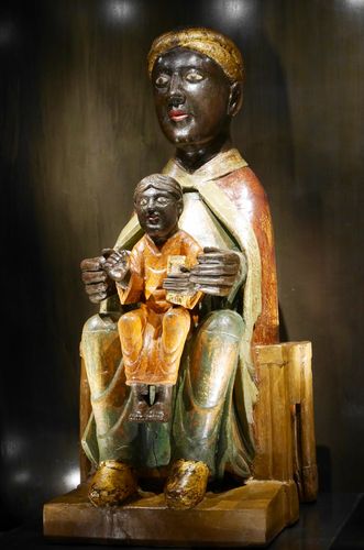 L'intérieur de l'église abrite la statue de la Vierge à l'Enfant, dite Vierge noire (ci-dessous). Cette œuvre est classée monument historique depuis le 12 novembre 1908 et fut restaurée cette année. Avec le développement du culte de la Vierge au XII ème siècle, le nombre de représentations de la Vierge à l'Enfant augmentera. Elle est ici figurée en tant que trône de Sagesse, tenant l'Enfant sur ses genoux. A souligner que cette Vierge noire de Meymac est la seule conservée en Corrèze, et que son originalité réside dans la coiffure de type oriental que porte celle-ci : elle explique le surnom d'Egyptienne parfois donné à cette statue. Au pied d'un autre pilier, se tient une autre statue de la Vierge à l'Enfant, statue mutilée (l'Enfant Jésus a perdu sa tête!) par un malfaisant. Simple profanation ou terrorisme ?