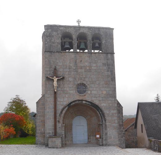 Découvrons aujourd'hui les alentours d'Ussel, à travers quelques lieux choisis. Je me rends tout d'abord à Saint Fréjoux, petite commune de la Haute-Corrèze, qui offre de voir l'église de Saint-Frédulphe, devenue Saint Jean-Baptiste. Si sa façade (en photo ci-dessous) est intéressante, l'intérieur permet d'admirer de jolies peintures murales, à condition toutefois de pouvoir y pénétrer (voir infos pratiques). Cette petite église romane est l'une des églises les plus intéressantes du pays d'Ussel, en particulier par son mobilier dont un remarquable devant d'autel en bois doré qui représente la Cène, œuvre des maitres-sculpteurs usselois datant de la fin du XVII ème siècle. On peut également y admirer un bras reliquaire en cuivre doré du XIII ème siècle présenté sous un coffre vitrine. L'autre découverte réside en ces peintures qui ornent le cul-de-four, et qui remontent au XVII ème siècle. Ces œuvres montrent une ribambelle d'anges, nus ou habillés, qui volètent autour de la colombe du Saint-Esprit, dans une gloire entourée de chérubins. Certains de ces anges portent à bout de bras une corbeille d'où s'échappent des grappes de fleurs, tandis que d'autres brandissent une couronne de fleurs au-dessus de leur tête. Ce lieu de culte est, avec l'église de Saint-Exupéry, la seule à offrir une telle voûte peinte sous l'Ancien Régime.