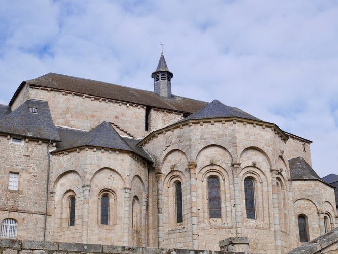 Face à moi, l'église de Meymac. Je vous parlais plus haut de l'ermite Mamacus. Celui-ci construisit au XI ème siècle une petite église dédiée à l'apôtre Saint André . Le 3 février 1085, Archambaud III, vicomte de Comborn, fonda le prieuré de Meymac, alors constitué de quelques moines bénédictins venus desservir l'église. C'est cette même année que débuta la construction de l'église abbatiale actuelle, d'architecture romane et classée. Le clocher porche est d'abord édifié dans le style roman limousin, dont les onze chapiteaux offrent des sculptures sur la foi, les rêves, les espérances des hommes et des femmes de l'époque. Le XII ème siècle verra quant à lui l'érection du choeur et du transept. Une nef très large, avec une voûte gothique, viendra parachever cette œuvre. En 1146, grâce à la contribution d'Ebles II de Ventadour, le prieuré deviendra abbaye, autour de laquelle se développera l'un des quatre principaux duchés de Ventadour. Aujourd'hui, les bâtiments conventuels de cette abbaye abritent la Fondation Marius Vazeilles, musée archéologique et ethnologique ainsi que le Centre d'art contemporain.