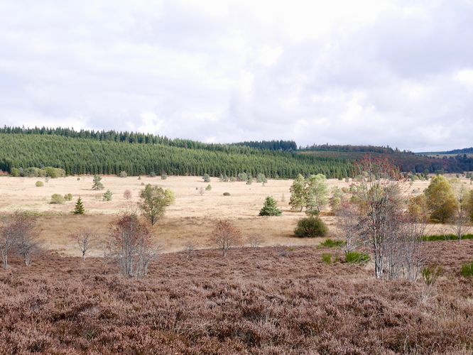 Sur le chemin, j'apercevrai la tourbière du Longeyroux (ci-dessous) qui invite à la promenade à travers des sentiers balisés (Linaigrette et Drosera) tout en plongeant dans une atmosphère particulière et un milieu biologique d'intérêt national riche de nombreuses espèces rares de la faune et de la flore, celle de la plus vaste tourbière du Limousin, sur 270 hectares.