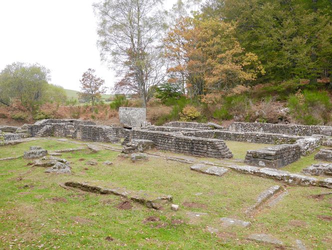 Je reprends la route en direction du site gallo-romain des Cars (ci-dessous) où l'on peut admirer les restes d'une villa romaine avec ses thermes, et un sanctuaire. Ce site date des II ème et III ème siècles. Au début du siècle dernier, seuls quelques blocs apparaissaient noyés dans les bruyères, jusqu'à ce que des fouilles, conduite par Marius Vazeilles, en 1936, ne permettent de dégager l'ensemble funéraire désormais visible, puis, deux cents mètres plus loin, une maison d'habitation. Au cours du premier millénaire avant J.C, l'endroit était maillé d'un réseau dense de domaines agricoles aux mains de propriétaires privés. Puis, le mode de vie des Romains pénètra le territoire à partir du premier siècle après J.C. Quand au site de la villa romaine, il permet d'observer une grande cuve monolithe taillée dans un seul bloc de granit, connue sous le nom de Bas des Cars. Ce réservoir d'eau alimentait grâce à des canalisations en plomb, une piscine et une vasque avec jet d'eau, tout en utilisant un système de chauffage par le sol, pour l'eau et les pièces.