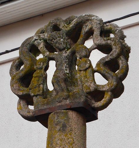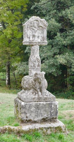 J'approche de Peyrelevade. Un peu avant ce village, sur la route de Cézeirat, se dresse la croix du Mouton (ci-dessous), croix de granit que l'on peut dater du XV ème siècle, et qui fit couler beaucoup d'encre. C'est certainement l'une des plus belles croix de chemin de Corrèze. Elle repose sur un bélier aux larges cornes, considéré parfois comme la représentation du diable. Le fût porte en réserve la croix de Malte et une main de justice. Sur une face de cette croix se trouve le Christ crucifié entre la Vierge et Saint Jean, et sur l'autre, la Vierge à l'Enfant, accostée de deux chandeliers. Cette croix prend tout son sens d'autant plus qu'elle se trouve dans une région marquée par la présence templière, et il n'en fallut pas davantage pour que certains l'attribue aux Templiers de la commanderie voisine de Feniers, qui dépendait depuis ses origines de l'ordre de l'Hopital et non de celui du Temple. Bref, c'est en fait à l'Hopital, devenu l'ordre de Malte, et non au Temple, disparu en 1311, que l'on peut rattacher cette magnifique croix.