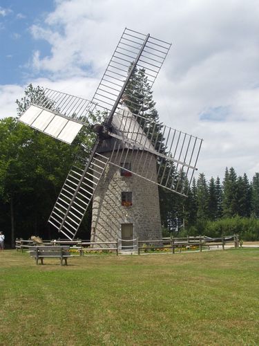 Située non loin d'Ussel, Valiergues possède le seul moulin à vent (ci-dessous) dans un département où, il faut bien l'avouer, tout tourne autour de l'eau, omniprésente, et où l'on croise plus souvent des moulins à eau, très nombreux sur les rivières et ruisseaux de Haute-Corrèze. La carte de Cassini, qui fut levée pour le pays d'Ussel dans les années 1770-1780, ne mentionne effectivement qu'un moulin à vent, près du village du Bech, sur la commune de Saint Bonnet Port Dieu. Le moulin de Valiergues, lui, fut bâti en 1840, au village de Betinas et à une altitude de 659 mètres environ. Il fonctionnera jusqu'à la fin du XIX ème siècle et il était encore possible d'observer ses ailes avec des lambeaux de voilure au début du siècle dernier. Ailes et toiture disparurent par la suite, jusqu'à ce que le bon vieux moulin soit restauré en 2001 et retrouve une nouvelle existence avec de nouvelles ailes. Ses meules restent quant à elles toujours muettes.
