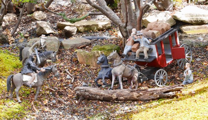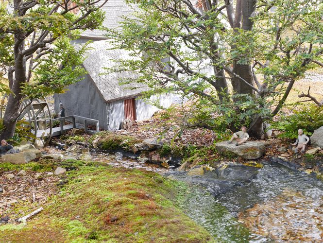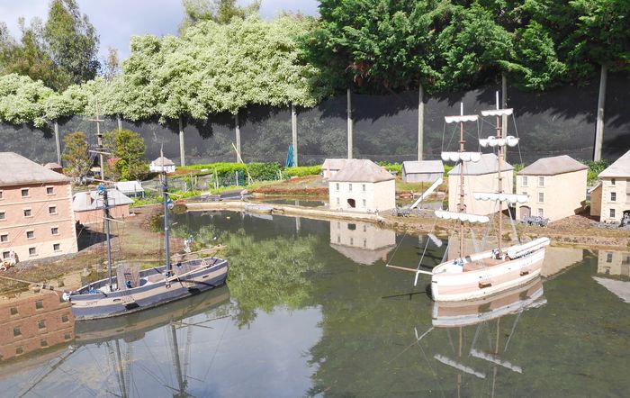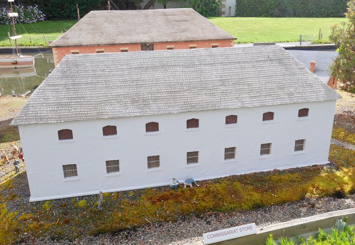 Les maquettes du parc ont été reproduites à l'échelle de 1:6, à l'aide de divers matériaux (ciment, plastique..) et à partir de plans d'archives de la ville d'origine. Quand aux arbres, on a utilisé des myrtes de Tasmanie qu'on tailla à la façon des bonsaïs pour arriver au résultat que l'on connait. Les personnages ont de leur côté été conçus en argile, cuits et peints à la main, ce qui représente un immense travail. Une fois prêt, le parc ouvrit ses portes pour la première fois en 1991. Je ne reviendrai pas sur le traitement infligé par les colons anglais aux Aborigènes, nous en avons déjà parlé dans un précédent article. La ville de Hobart telle que je la découvre dans le parc miniature est celle des années 1820, vingt ans après le début de sa construction. Sullivans Cove (ci-dessus) est représenté avec deux navires au mouillage, le Lady Nelson et le Amity. La tâche n'était pas aisée pour les nouveaux arrivants qui ne disposaient pour bâtir la ville que d'une main d'oeuvre peu qualifiée et souvent inutile. Collins mourra d'ailleurs d'épuisement en 1810 et sera remplacé en 1817 par le gouverneur Sorell, lequel s'attèlera à la rénovation des bâtiments précédents qui étaient dans un état de délabrement avancé. L'île de Hunter (qui n'est plus visible aujourd'hui, excepté ses anciens entrepôts) occupa une place prépondérante au tout début de la colonisation. Le ruisseau de Hobart (ci-dessous) lui aussi a depuis disparu et ne représente plus de nos jours qu'un conduit d'eau souterrain sous la ville. A l'époque, des magasins d’approvisionnement (deuxième photo) abritaient les denrées nécessaires à la survie d'une colonie qui ne se développait pas assez vite aux yeux du gouverneur Macquarie, lequel visitera Hobart en 1811.