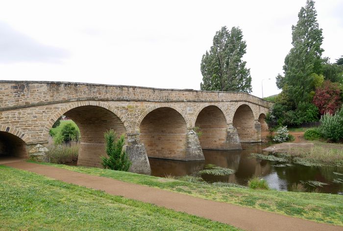 Richmond, qui se trouvait jadis sur la route des bagnards, fera appel à ces derniers pour bâtir le fameux pont à arches (en photo ci-dessous) qui servira de liaison entre Richmond et Port Arthur et fait désormais partie du patrimoine australien depuis 2005. Reconnu d'utilité publique dès 1820 par le commissaire royal John Thomas Bigge (qui prêtera un temps son nom à l'ouvrage), la première pierre de la construction sera posée trois ans plus tard, et le pont achevé en 1825. On utilisa pour l'occasion du grès extrait de Butchers Hill, qui fut ensuite transporté jusqu'au chantier à l'aide de chariots à bras tirés par les bagnards.