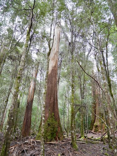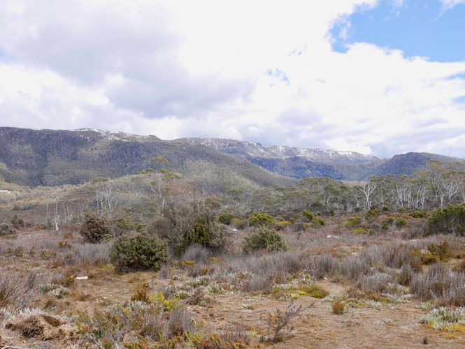 J'ai l'intention de me rendre jusqu'au lac Dobson, situé à seize kilomètres de là. Une piste transalpine fut tracée jadis, et dans un premier temps, jusqu'au lac Fenton. Mieux vaut disposer d'un véhicule 4X4 pour y accéder mais je n 'éprouverai aucune difficulté à conduire ma voiture sur ce parcours parfois chaotique et plus ou moins glissant. Je déconseillerai par contre l'usage de cette route par temps de pluie. L'axe de circulation est relativement étroit mais autorise la circulation dans les deux sens. Mieux vaut donc ne pas rouler trop vite (vitesse limitée à 40 km/h) pour pouvoir croiser un autre véhicule en toute sécurité. La route transalpine est enfin divisée en tronçons ouverts (ou pas) au trafic, en fonction des conditions climatiques du moment. C'est qu'il neige ici l'hiver. Le Mont Field devint très tôt une destination de choix pour de nombreux skieurs dès les années 1920. Certains aventuriers plus audacieux que d'autres avaient pris l'habitude de partir dans la forêt enneigée, souvent avec des skis fabriqués maison et des bâtons improvisés. Le développement de ce passe-temps aboutira naturellement à la naissance du Ski Club de Tasmanie en 1926, dont le premier projet sera de bâtir un refuge à Twilight Tarn (lequel existe encore de nos jours), histoire d'offrir un point de chute aux excursionnistes. Le lac Fenton offrira un refuge similaire qui sera régulièrement pris d'assaut en période hivernale. Je longerai le lac en voiture mais ne trouverai malheureusement aucun endroit où me garer pour m'y arrêter. La prolongation de la piste jusqu'au lac Dobson aura lieu en 1937 et arrangera bien des skieurs. Les repères d'enneigement placés le long du parcours permettent d'imaginer les quantités impressionnantes de neige qui tombent en hiver et recouvrent les paysages (ci-dessous) que j'admire aujourd'hui. Je repense à ces ouvriers dont la mission fut de tailler cette piste à travers une forêt jusque là hostile. Leur tâche n'était pas facile et ils ne bénéficiaient même pas de sanitaires sur place. L'hiver était glacial et l'humidité causait aussi de nombreux problèmes. Et la facilité d'accès aux lacs de permettre l'utilisation des réserves d'eau du lac Fenton dès les années 1930, grâce au creusement d'un tunnel sous la montagne destiné à acheminer le précieux liquide jusqu'aux quartiers nord de Hobart.