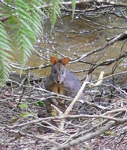 La beauté naturelle des chutes de Russell attira les premiers touristes dès 1885. Et les classes moyennes de l'époque de se presser pour les admirer dès la fin du XIX ème siècle. Leur accès est aisé car je n'aurai besoin que d'un quart d'heure pour les atteindre, depuis le bureau du parc. La promenade à travers la forêt est rafraichissante et je tomberai nez à nez avec un petit kangourou (ci-dessous) qui ne tardera pas à me fausser compagnie, peu rassuré par mon K-way rouge.