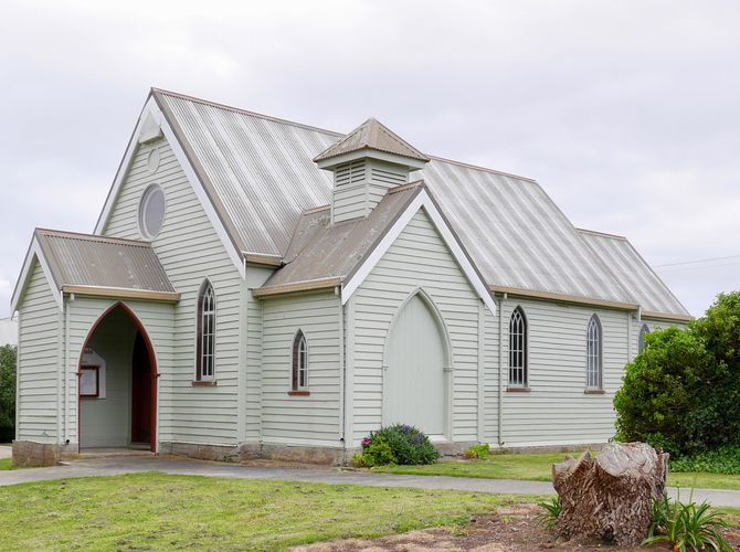 La religion avait aussi sa place à Stanley : l'église anglicane St Paul (ci-dessous) se dresse toujours au 39, Church Street. C'est John Lee Archer qui traça les plans de l'église d'origine en 1842, dans laquelle sera consacré le premier évêque de Tasmanie. Juste à côté, se trouve l'église presbytérienne de St James (deuxième photo), voisine de la sépulture de Marie Bogue (troisième photo). Cette église fut livrée en préfabriqué depuis Londres, en 1855, puis fut montée ici à Stanley, pour un coût de 400£ de l'époque. Quant à la tombe de Marie Bogue, elle est un hommage à cette femme aborigène connue aussi sous le nom de Black Mogg. Sa disparition est entourée de mythes et de légendes, et Meg, d'en donner d'ailleurs les détails dans l'un de ses ouvrages,Historic Stanley. Mary vivait avec David Howie, ancien détenu, devenu plus tard gendarme à Bass Strait. Le 20 août 1851, le couple et son enfant entamèrent un long voyage par bateau de l'île Robbins jusqu'à Stanley, lorsqu'une violente bourrasque projeta le bateau contre le rocher The Nut, le faisant immédiatement sombrer. Le mari, David, fut rescapé, mais pas Mary Bogue et son enfant que l'on retrouvera enfermés dans une cabine du navire.