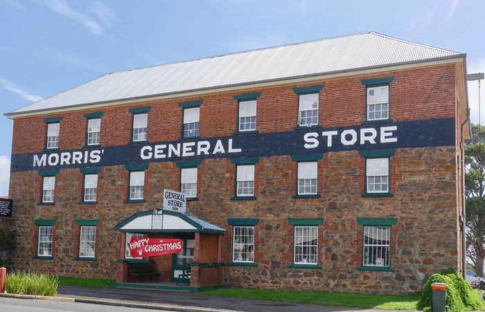 On me propose de découvrir les différentes maisons de Swansea à l'aide d'une feuille de route (voir infos pratiques) répertoriant les lieux remarquables de la ville. Comment ne pas s'intéresser au Morris' General Store (ci-dessous) ? Au début des années 1830, un certain John Alexander Graham, marchand ambulant, se rendait de ferme en ferme pour vendre ses marchandises, avant de fixer son commerce à Swansea. On sait que le premier commerce de la ville date de 1833 et vendait du bois. Cinq ans plus tard, on assistera à la construction de l'édifice à trois niveaux de Stone & Brick, dont les niveaux supérieurs seront réservés d'une part à l'entreposage de la laine et des peaux dans l'attente de leur exportation, et d'autre part, au stockage des biens importés destinés à la vente. Ce bâtiment est aujourd'hui en excellent état et a merveilleusement traversé les âges. Seuls quelques travaux d'entretien furent nécessaires, comme le changement du toit, et l'ouverture d'un accès donnant sur le supermarché IGA actuel (qui existe depuis 1965). James Morris, fils de Thomas et Sarah Morris, nous venait d'Angleterre (où il quittera momentanément les siens) et débarqua en Tasmanie à l'âge de 24 ans, en 1853, alors bien déterminé à se faire une place. Favorablement impressionné par les perpectives d'avenir qu'offrait l'île, il fera venir sa famille un an plus tard en Tasmanie, en leur garantissant un emploi dès leur arrivée. Et lui-même de faire l'acquisition du fameux magasin lors d'une vente aux enchères, en mars 1868. Une affaire qui restera dans la famille cinq générations durant.
