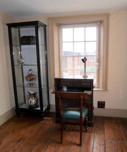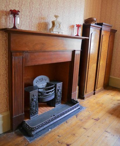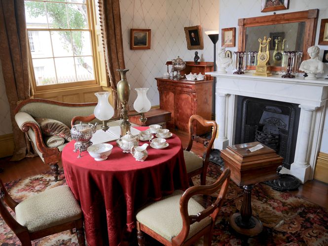 La pièce voisine est le salon (ci-dessous en photo) ou drawing-room, espace de vie féminin par excellence, où les dames avaient pour habitude de prendre le thé. Ainsi concoctaient-elles leur mélange à l'aide de la théière (deuxième photo) puis le confiaient aux domestiques pour qu'ils préparent l'infusion. Le terme drawing-room était en réalité la contraction du withdrawing-room, une pièce où l'on se retirait après le diner afin de prendre le thé, de s'adonner à la broderie ou d'écouter de la musique, tandis que les messieurs demeuraient dans la salle à manger autour d'un digestif et fumant le cigare, tout en discutant affaires. En dépit des apparences, les garnitures de la cheminée étaient en bois, tout comme les plinthes du plafond. Les teintes de la pièce étaient aussi plus claires que dans la salle à manger. Quant à la menuiserie, elle était constituée de bois de pin et de cèdre, souvent peinte. Le papier-peint, lui, représente une pièce de soie blanche tendue à l'aide de cordelettes et ornée de petites roses décoratives. Autrefois, le salon était habituellement meublé avec des objets en bois de placage offrant le meilleur effet.