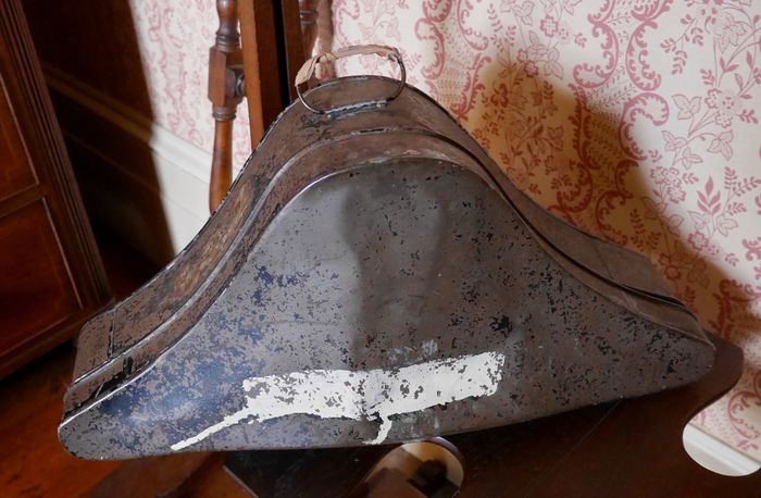 En face de cette salle, on pénètre dans la chambre d'amis (ci-dessous). Celle-ci pouvait occasionnellement abriter des visiteurs d'affaires pour la nuit. Y trône un lit à baldaquin et d'épais rideaux à la fenêtre. J'y remarque également une boite à chapeau (deuxième photo).