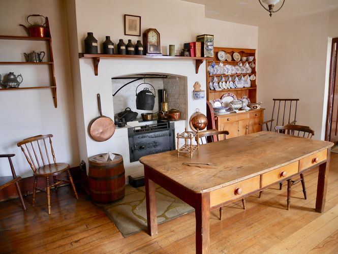 Retour au rez-de-chaussée avec la cuisine (ci-dessous), située dans une aile à part et ce, pour des raisons de sécurité. En effet, il arrivait parfois que le feu se déclare et embrase la maison, d'où ces précautions. Le poêle en fonte, alimenté au charbon, date de 1858. Quant à l'arrière-cuisine, devenue aujourd'hui un bureau, elle était utilisée pour faire la vaisselle et procéder au nettoyage des ustensiles.