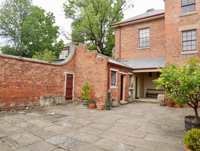 La cour (deuxième photo) au sol pavé était vaste et profitait de l'ensoleillement et de la chaleur de son orientation nord. Autrefois, un petit office ainsi qu'une buanderie y avaient été installés. En 1905, on y trouvera même des toilettes localisées entre cette cour et l'arrière-cuisine. Une vaste buanderie y prendra aussi place lorsque Narryna fera office de pension de famille, entre 1926 et 1946.