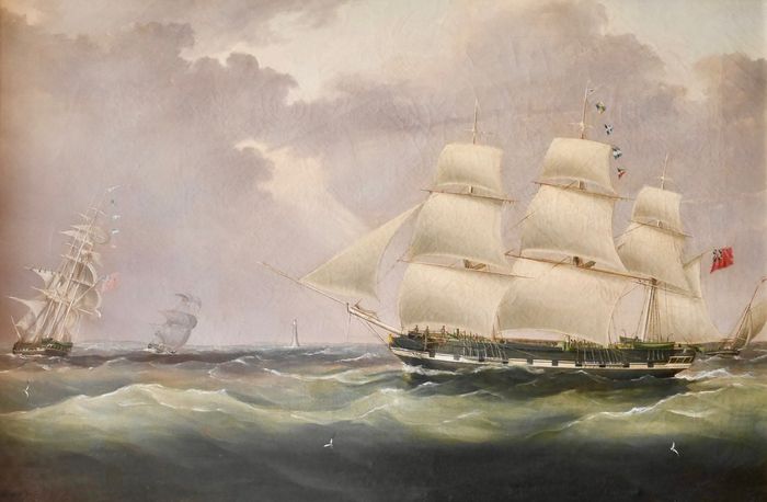 Pénétrons à l'intérieur de Narryna et découvrons ce hall d'entrée (ci-dessus) avec ses plinthes moulées et son papier peint un peu spécial. L'arche du hall reprend celle que l'on peut distinguer à l'extérieur de la maison, au niveau de la porte d'entrée. Le fameux papier-peint représentant des pierres de taille est une reprise du motif existant déjà à Highfield Historic House (Stanley) en 1840. Je peux admirer sur les murs plusieurs peintures, dont celle du navire « Sir John Rae Reid » (deuxième photo ci-dessus), sur lequel le capitaine Andrew Haig effectuera plusieurs voyages entre la Tasmanie, Londres (Angleterre), Calcutta (Inde) et l'île Maurice dans les années 1833-1837. Une horloge ayant appartenu à Georges Washington Walker, marchand et fondateur de la Hobard Savings Bank, est également visible.
