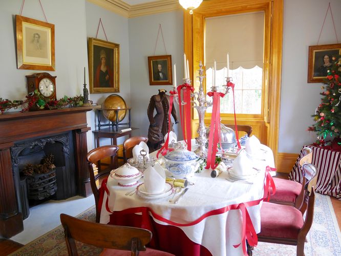 La fonction d'un tel hall est de donner accès sur les pièces de la demeure, des pièces jadis fréquentées par les partenaires commerciaux d'Andrew Haig. Comme, par exemple, cette salle à manger (ci-dessous) qui accueillera de nombreux convives pour des repas somptueux. On sait que Andrew Haig donnera plusieurs diners en l'honneur du gouverneur John Franklin et de l'évêque Broughton. Et cette pièce d'être alors décorée dans le style masculin qui convenait le mieux aux personnes qui y séjournaient : cheminée de couleur sombre, papier-peint chargé et menuiseries peintes façon chêne anglais. De même, plusieurs portraits sont disposés pour rappeler les lignées familiales.
