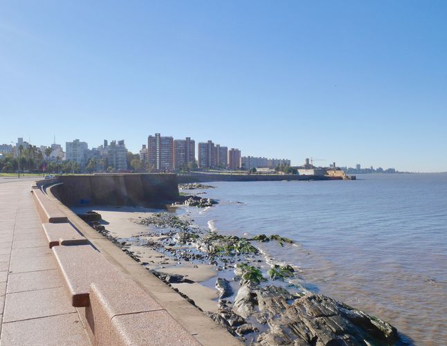 Pour mon deuxième jour à Montevideo, je pars tôt et à pied de mon hôtel afin de me promener dans le centre historique de la capitale uruguayenne. La journée d'hier fut consacrée à mon installation : je me posais à mon hôtel, effectuais quelques courses et repérais les lieux. J'ai par ailleurs prévu de repasser par Montevideo fin mai pour y terminer ce long séjour. Le beau soleil qui brille m'incite à partir à la découverte des endroits les plus remarquables de la capitale, et la liste de ceux-ci qui m'a été fournie par l'office de tourisme est conséquente. Il me faudra 45 minutes de marche, en passant par le bord de mer (photo ci-dessous) avant d'atteindre le début de ma balade. Les rues arborées sont encore désertes en ce début de matinée et j'apprendrais un peu plus tard que rien n'ouvre avant midi le dimanche. J'erre donc dans cette ville encore endormie en me battant contre l'invasion de moustiques qui déferle actuellement sur le pays, à la suite des fortes pluies de ces derniers jours. Tout comme à Buenos Aires (Argentine), je dois affronter les trottoirs souvent défoncés des rues et me prendrai d'ailleurs une belle flaque d'eau cachée sous une dalle descellée dans la rue Perez Castellanos.
