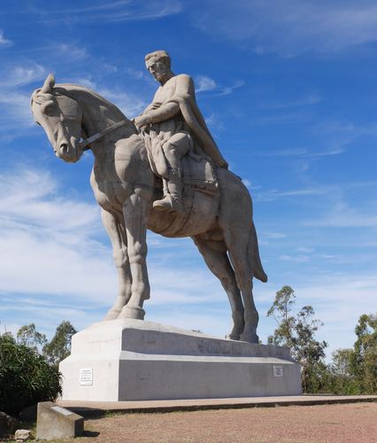 Je ne pouvais pas clore cette promenade sans me rendre sur la colline Artigas, là où se trouve le parc du même nom qui abrite la plus grande statue équestre d'Amérique du Sud. Fermement accrochée à son piédestal, l'oeuvre en pierre (ci-dessous) culmine à une hauteur de dix mètres sur neuf de large. Elle fut créée par l'artiste Setillo Belloni , les croquis de la statue ayant été tracés par le même artiste et son père, le célèbre José Belloni. Inaugurée en 1974, l'oeuvre domina d'abord la colline Ventura, rebaptisée depuis colline Artigas, du nom de l'illustre général uruguayen. Son poids total est de 135000 kg et l'oeuvre est faite de béton armé, de gypse et de bronze. Quant au général José Gervasio Artigas, il fut militaire et homme d'Etat du Rio de la Plata et s'illustra lors de la Guerre d'indépendance des Provinces unies du Rio de La Plata. IL fut aussi le chef des Orientaux en créant de fait la Province orientale en 1813, zone située à l'est du fleuve Uruguay et au nord du Rio de La Plata (correspondant grosso modo à l'Uruguay actuel). Né à Montevideo (alors incluse dans la vice-royauté du Pérou sous autorité espagnole) en 1764, il passera son adolescence à s'exercer à cheval et au maniement des armes sur les terres familiales, en observant attentivement les gauchos. Il entretiendra également des liens étroits avec les Indiens Charruas et passera du temps à leurs côtés. A 33 ans, il devient militaire et rejoint le nouveau corps de Blandengues de Montevideo, une milice destinée à la protection des frontières. Plus tard, son œuvre le fera souvent passer pour le fondateur de la nation uruguayenne.