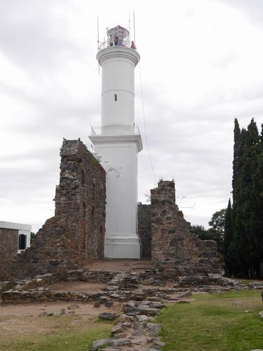 La Grande Place du 25 Mai, elle, fut construite lors de la fondation de la cité et demeure le plus grand espace du quartier historique. Il s'y déroulait jadis des manœuvres militaires. Celle-ci rassemble plusieurs attractions : on y trouve d'abord le Musée portugais, installé dans une demeure portugaise datant du XVIII ème siècle, qui offre d'admirer le blason original de la porte de la citadelle, mais aussi du mobilier portugais d'époque, des armes, des objets artisanaux et des cartes datant des XVIè et XVIIè siècle. Juste à côté, se dresse le Musée naval, fondé en 2009. A deux pas de là, je découvre les ruines du Couvent de San Francisco (ci-dessous) dominées par le phare. Ce couvent aurait été bâti au cours des années 1690, mais un gigantesque incendie détruira l'ensemble en 1704. A l'intérieur se trouvait la Chapelle de la Conception qui comprenait autrefois une tour faisant alors office de phare. Le phare actuel fut quant à lui achevé en 1857, au pied des ruines de l'ancien couvent. Sa construction débutera en 1845 grâce au travail acharné des soldats de Juan Manuel Rosas, mais les travaux seront un temps suspendus à cause de la guerre. Il mesure 34 mètres de haut et se distingue par son éclat de lumière blanche émis toutes les neuf secondes qui est visible à plus de six miles de là, depuis le large et par temps clair. A mi-chemin entre la porte de la citadelle et le port, se dressait autrefois la gare ferroviaire de Colonia : celle-ci sera inaugurée le 1er avril 1901, avec l'arrivée du premier convoi en provenance de Montevideo. Tout un symbole.