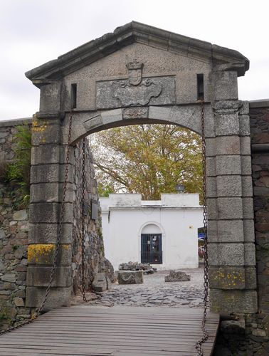 C'est donc la vieille ville que je vais visiter, le quartier historique (Casco historico). Je gare mon véhicule près du stade de football puis me rend à l'office de tourisme qui se situe à côté de la Intendencia (ci-dessus). Cinq minutes suffisent pour que j'organise mon parcours grâce au plan très complet qui m'est remis par une employée : celui contient non seulement le plan de la ville de Colonia (avec un gros plan sur le centre historique) mais aussi les 17 sites à ne pas manquer sur place. La visite à pied se fait très facilement et il me faudra une heure environ pour faire le tour des sites remarquables. Je pénètre dans la vieille ville en franchissant la porte de la citadelle (ci-dessous) qui fut restaurée en 1968 et 1971, avec son pont-levis et les restes de l'ancienne muraille. Cette porte sera bâtie en 1745 sur l'ordre du gouverneur portugais Vasconcellos, lequel sera un temps propriétaire de terrains sur place mais également un grand bâtisseur. Ladite porte fait face à la Place de 1811, qui abrite un office de tourisme. Il est recommandé d'admirer cette porte la nuit pour profiter pleinement des illuminations.