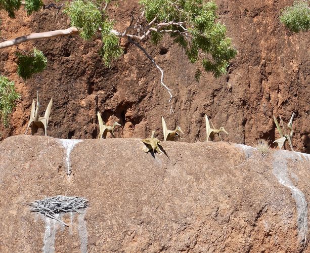 Je me gare sur le parking du centre situé au milieu de nulle part après avoir facilement trouvé mon chemin depuis Winton. Le centre est depuis peu relié à la route de Longreach par une route bitumée qui remplace une ancienne piste de terre. Ma visite, qui durera trois heures, se décomposera en trois parties : la découverte du Canyon des Dinosaures, une visite au laboratoire d'analyse des ossements et un passage au petit musée rassemblant les ossements mis à jour. On me donne rendez-vous sur place à 9h15 pour embarquer à bord d'une navette électrique conduite par Kate, ma guide pour cette première étape. Nous roulerons deux kilomètres (dix minutes environ) avant d'atteindre le parcours du Canyon des dinosaures qui consiste en une promenade d'une trentaine de minutes sur des passerelles aménagées surplombant différents paysages reconstitués sur près de 300 mètres. Chaque dinosaure local dispose de sa galerie sponsorisée, et de sa carte d'identité qui explique ses origines, son mode de vie....Petits et grands sont également invités à colorier leur passeport à chaque étape en guise de souvenir.