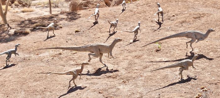 Les sauropodes (comme le diamantinasaurus plus haut) sont les plus gros animaux ayant jamais existé sur la terre. Ces dinosaures géants avaient un long cou, une petite tête et de gros membres inférieur pour supporter leur corps massif. Végétariens, ils se nourrissaient d'énormes quantités de végétaux trouvées dans les zones forestières. Les Ornithopodes étaient également des dinosaures herbivores présents sur tous les continents et de tailles très différentes (depuis la taille d'un poulet jusqu'à celle d'un animal mesurant 7 à 9 mètres de long). Les Théropodes, eux, appartenaient à une catégorie de dinosaures carnivores. Rapides et musclés, ils se mouvaient grâce à des pattes puissantes et pouvaient courir jusqu'à trente km/heure pour attraper leur proie. Leurs pieds étaient formés de trois griffes et leur mâchoire disposait de grosses dents acérées. Le théropode australien qu'on a retrouvé le mieux conservé à ce jour le fut à Winton en 2006. La prochaine étape du parcours des dinosaures me conduit justement à observer un groupe de 24 petits dinosaures (deuxième photo) fuyant devant un théropode Stampede fort agressif.
