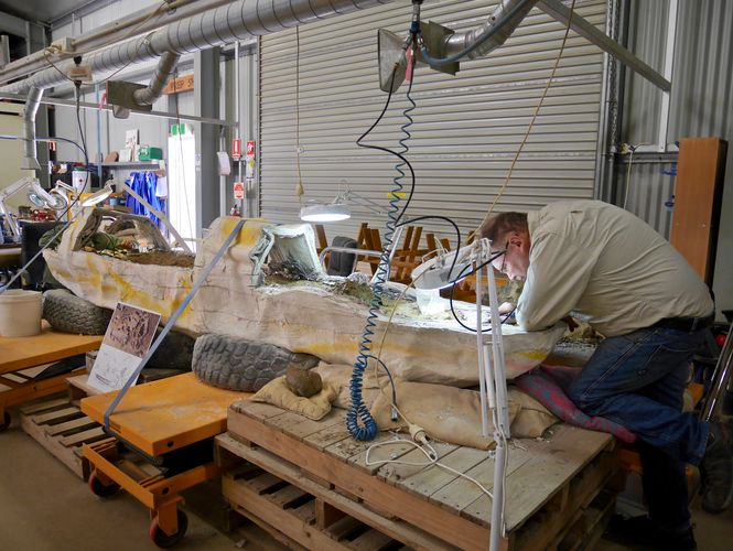 Cette première visite achevée, et de retour à la réception, il est temps pour moi de me rendre à pied au laboratoire des dinosaures qui se trouve à 500 mètres de là. Ouvert depuis 2009, ce lieu d'analyses des ossements de dinosaures permet de comprendre le chemin parcouru depuis les terres de notre fermier David Elliott jusqu'à l'exposition des restes d'animaux dans le musée. Karen sera mon guide pour l'occasion et m'expliquera comment débuta cette recherche d'ossements et comment on procède. J'apprendrai ainsi qu'à chaque découverte d'un ossement on enferme celui-ci à l'intérieur d'une enveloppe protectrice faite de papier journal et d'un genre de plâtre, puis on transporte le tout jusqu'au laboratoire. Des équipes vont alors délicatement débarrasser l'ossement en question (ci-dessous) des impuretés et des débris qui l'entourent, jusqu'à obtenir le résultat comme, par exemple, ce fémur de sauropode présenté par Karen (deuxième photo)