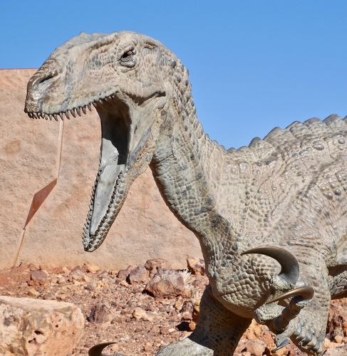 Je découvrirai enfin le Minmi Kunbarrasaurus, un genre de dinosaure herbivore australien, haut de 1,70 mètre et long de trois mètres. L'animal vécut lors du Crétacé inférieur (104 à 102 millions d'années) et avait le dos recouvert d'épines osseuses. Il vivait en petits groupes (ci-dessous) et avait justement comme pire prédateur l'Australovenator (deuxième photo), ce théropode surnommé Banjo du nom du poète Banjo Patterson, appelé aussi dinosaure Stanpede, qui vécut au cours du Cénomanien (premier étage du Crétacé supérieur), il y a 98 millions d'années. Ce dernier mesurait 5 à 6 mètres de long, 1,50 mètre de haut pour un poids de 300 kg. Ces cinq galeries qui forment cette promenade sur les dinosaures s'avèrent fort intéressantes et offrent à chaque fois des panneaux d'information sur chaque animal.