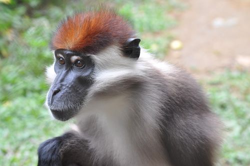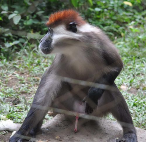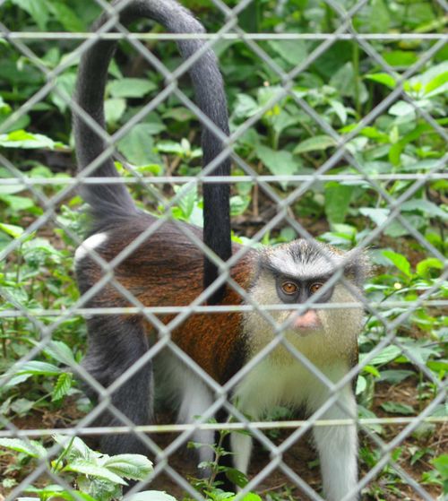 Un peu plus loin, voici les cercocèbes à collier blanc. Cette race de singes vit dans les vallées forestières et dans les forêts galerie. Les cercocèbes ressemblent un peu aux guenons. On les trouve en groupe de 14 à 23 individus ( avec quelques mâles et de nombreuses femelles). Les fesses des mâles ont une particularité: Elles sont soudées. En cas d'agression imminente, le cercocèbe secoue la tête en baillant ou baille tout simplement.