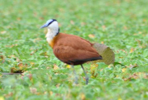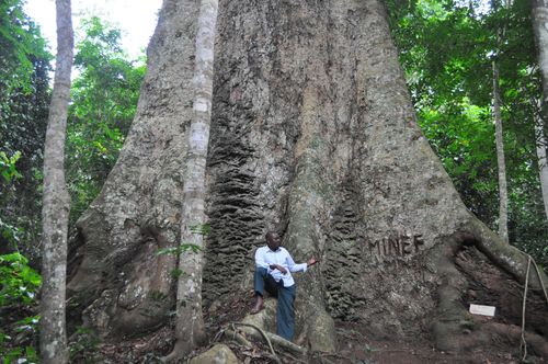 Après le déjeuner, nous embarquons sur trois pirogues en acajou , afin de naviguer sur le fleuve Nyong. Ce fleuve camerounais prend sa source dans l'Est du pays à Abong-Mbang. Il est long de 800 kilomètres et n'est pas actuellement à son niveau le plus élevé. Nous sommes à la fin de la saison sèche et le niveau du fleuve montera de quelques mètres d'ici à quelques semaines. Notre promenade est reposante ( sauf pour les piroguiers qui affrontent le courant assez fort par endroits sur la première partie du parcours). Le jacana ( ci-dessous) surnage au-dessus des herbes. Le liseron d'eau nous offre quelques fleurs roses ici et là. Et de nombreuses herbes peuplent les rives du Nyong. Sur la berge, la forêt s'étend avec de grands arbres. Ces derniers accueillent bien souvent des orchidées qui se nourrissent de l'air du temps. Bientôt, nous accosterons sur un autre partie du fleuve et nous promènerons dans la forêt , à la découverte des différentes essences: L'oboto, l'arbre qui soigne les plaies et les maux, l'ebiera, l'ébène, l'assas ( l'arbre qui s'autoprotège jusqu'à trois mètres au dessus du sol grâce à son tronc recouvert de piquants) et le kosipo ( le plus grand arbre de la forêt, promis à l'abattage il y a quelques années mais sauvé in extremis par l'Ambassadeur d'Espagne lors d'une visite officielle au Cameroun). Le kosipo est l'arbre à palabres. Celui devant lequel se trouve Ernest ( ci-dessous) a environ 1175 ans et mesure 80 mètres. Il fait partie de la même famille que le sapeli et le sipo , avec le même feuillage, consommé par les mêmes chenilles noires)