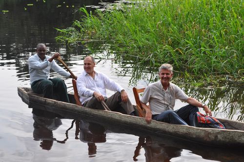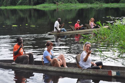 Ernest, notre guide piroguier nous conte son aventure: Originaire du village d'Ebogo, il a suivi des études et obtenu son diplôme de Sciences économiques à l'université en 1994. Piroguier dès l'âge de 11 ans, il choisit bientôt de devenir guide ( depuis 2005) afin de découvrir la région qu'il affectionne tant aux touristes de passage. Il suit alors une formation bilingue offerte par le Ministère camerounais du Tourisme et par d'anciens guides nationaux. Parallèlement, il fait un stage chez 'Herbier national ( société liée au Ministère des Eaux et Forêts) et apprend à reconnaître les plantes pendant six mois. Grâce à BirdLife, une ONG britannique, il découvre les oiseaux de l'Afrique de l'Ouest. Seul , il se lance à la découverte des papillons et des orchidées ( dont il a , à ce jour, dénombré 21 espèces). Ernest travaille en free lance. Il trouve même le temps de former d'autres piroguiers qui, demain, feront découvrir à leur tour la forêt camerounaise à des touristes toujours plus nombreux. Ernest aime son métier. Il le dit et ça se sent.