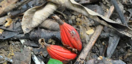 J'aperçois ici et là des fèves de cacao. Et puis des fruits un peu plus petits, les afromomans dont sont friands les primates. Ils poussent en grappes au ras du sol.