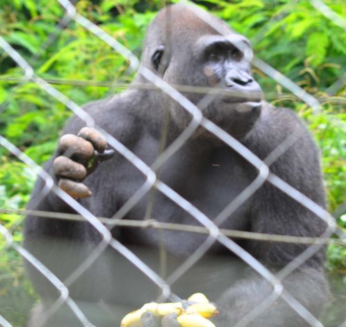 Le gorille boit peu d'eau. Mais ingurgite jusqu'à trente kilos de nourriture chaque jour. On en compte sept spécimens dans le parc de Mefou ( l'année 2009 fut d'ailleurs l'année du gorille à Mefou).