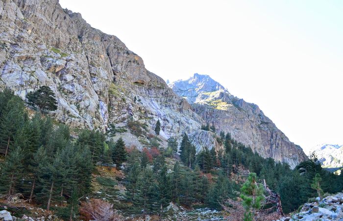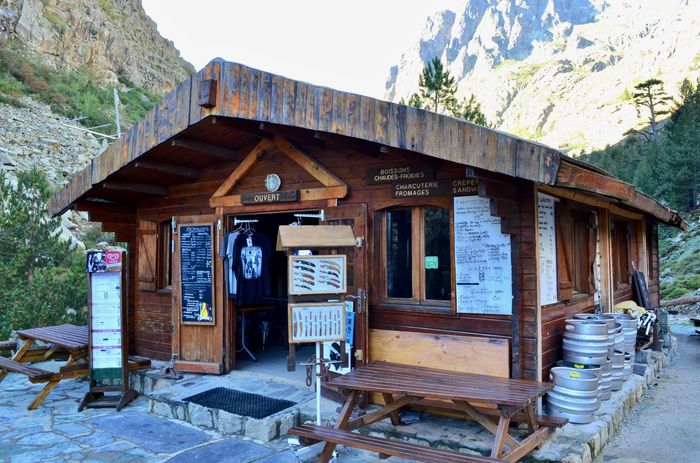 La Restonica est une rivière au cours accidenté qui offre aux plus curieux cascades et piscines naturelles d'eau fraiche et limpide. On nous conseille vivement de partir vers les bergeries de Grotelle tôt le matin pour se trouver dans le flux montant des véhicules et éviter ainsi de devoir croiser d'autres voitures. Je suis surpris de voir autant d'automobilistes sur cette petite route en cette fin de saison, d'autant plus que le parking qui se trouve en fin de parcours est de petite taille et ne pourra pas accueillir tout le monde. Sur place, un petit refuge (ci-dessous) offre restauration et souvenirs aux clients de passage. Le parking, lui, habituellement payant durant la saison, est gratuit ce matin. Nous ne nous attarderons pas pas longtemps au fond des gorges car l'endroit reste avant tout un point de départ pour des randonnées dans les alentours. Le sentier qui s'enfonce dans la montagne s'effectue d'abord en montée assez douce sur la moitié de son parcours avant de devenir franchement plus rude pour les non initiés. Il est fortement conseillé d'être équipé pour la randonnée, avec chaussures de marche et équipement adapté pour pratiquer ce genre d'activité. Depuis ce refuge, comptez entre 1h45 et 2h00 pour atteindre le lac de Capitello, le plus haut des lacs d'altitude situé à 1930 mètres, mais aussi le plus profond des lacs glaciaires corses avec 40 mètres de profondeur.