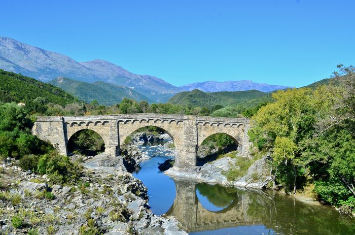 Après notre escapade dans les gorges de la Restonica, nous redescendons jusqu'à Corte pour nous rendre jusqu'à Altiani, un petit village perché (en photo ci-dessous) dans la vallée du Tavignano, au bas duquel se trouve un superbe pont génois (deuxième photo) à trois arches, dont la conception date de l'élargissement effectué par l'intendant Boucheporn, juriste français qui deviendra intendant de Corse entre 1775 et 1785. Notre homme encouragera par ses ordonnances le développement de la forêt, de l'agriculture et de l'industrie tout en organisant, à partir de 1778, un élargissement des ponts de l'île. L'ouvrage génois d'Altiani, classé sur la liste des monuments historiques, sera quant à lui agrandi et restauré au 19è siècle et est aussi appelé pont Laricio (en référence au pin de Corse du même nom). Il est agrémenté à son extrémité de la petite chapelle Saint Jean-Baptiste, de l'ancienne piévanie de Rogna, datant des 17è et 18è siècle, mais malheureusement dissimulée par un camion en stationnement lors de notre venue.