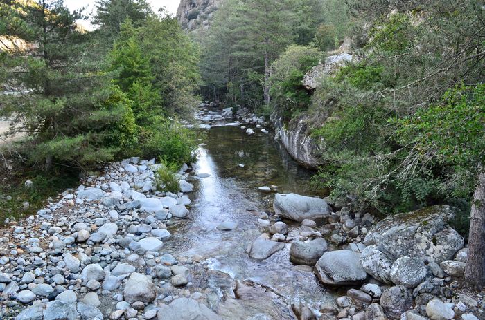 La rivière Restonica (en photo ci-dessous) qui nait dans le massif du Retondo, à 2622 mètres, s'offre une course mouvementée dans ces gorges escarpées avant de rejoindre le Tavignano une fois arrivée à Corte. C'est un site de 6500 hectares que nous nous apprêtons à traverser en empruntant la scabreuse D623. Mieux vaut être prudent et patient au volant pour effectuer ce parcours car le croisement d'autres véhicules peut vite s'avérer délicat, voire dangereux, sur certaines portions du trajet.