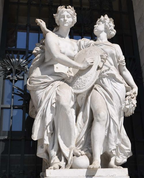 On fera appel pour l'occasion aux artistes étrangers les plus réputés ainsi qu'à des spécialistes en machinerie scénique. Les sculptures du tympan de la façade principale seront ainsi confiées à Leonardo Bistolfi : Une femme dévêtue représente l'Harmonie, et est entourée de deux personnages symbolisant l'Inspiration et la Musique, le tout formant la Symphonie ( voir ci-dessous)